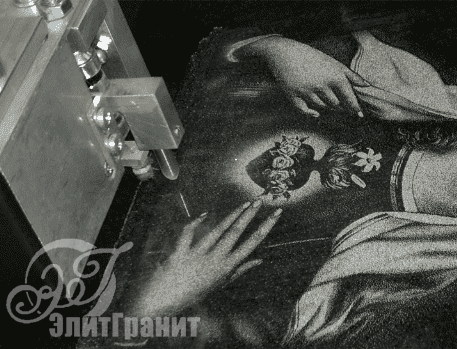 Второй этап работы — непосредственно сама гравировка на памятнике: фотография загружается в компьютерную программу, которая управляет гравировальным станком. Станок работает по принципу принтерной печати: он выбивает на граните бороздки алмазной иглой различной глубины. Важно отметить, что в отличии от ручной гравировки, в компьютерной вероятность ошибки из-за человеческого фактора стремится к нулю.